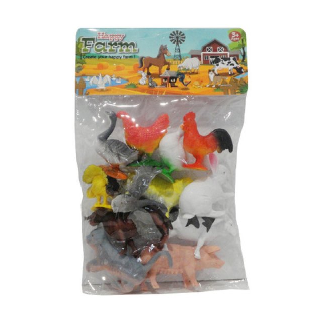 12 mājdzīvnieku figūru komplekts. Komplektā, cita starpā, ir zirgs, govs, aita, trusis, cūka, gailis un citi. Viss ir iepakots polietilēna maisiņā. Norādītie izmēri ir produkta izmēri iepakojumā. Iepakojuma izmērs 21x31x6 cm.