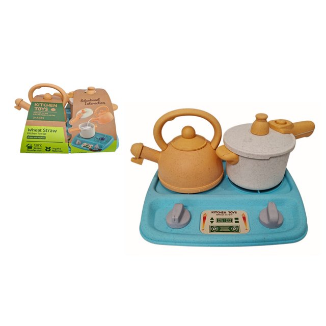 Virtuves komplekts ar tējkannu, katlu un plīti. Izgatavots no kviešu salmu tipa materiāla.  Norādītie izmēri ir komplekta izmēri iepakojumā: 22x13x8 cm. Rotaļlieta paredzēta bērniem no 3 gadu vecuma.