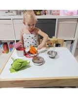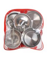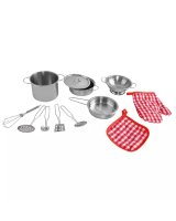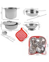 Komplektā ietilpst 13 elementi, tas ir, viss, kas nepieciešams mazam pavāram: 2 katli, panna, caurduris, vāks (der jebkurai pannai), dažāda veida karotīšu komplekts, mugursoma un auduma paklājiņš ar cimds.Komplekts viegls un ērts. Tas ir iepakots caurspīdīgā mugursomā, kas ļauj bērnam to ērti paņemt līdzi uz bērnudārzu, pie drauga vai uz pie vecmamiņas. Tas ir maza izmēra un neaizņem daudz vietas, tāpēc to ir viegli uzglabāt.Rotaļlieta ne tikai ļauj interesanti un jautri pavadīt laiku, bet arī ietekmē bērna intelektuālo un motorisko prasmju attīstību; attīsta iztēli un rosina radošumu, kā arī māca grupu sadarbību un pilnveido sociālās un integrācijas prasmes. Klasiskā metāliskā krāsa piestāvēs jebkurai bērnu virtuvei. SPECIFIKĀCIJA: - materiāls: metāls; - mugursomas izmēri: 20 x 21 x 7,5 cm; - elementu skaits: 13; svars: 0,268 kg; Komplekta svars: 0,287 kg.