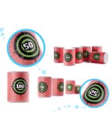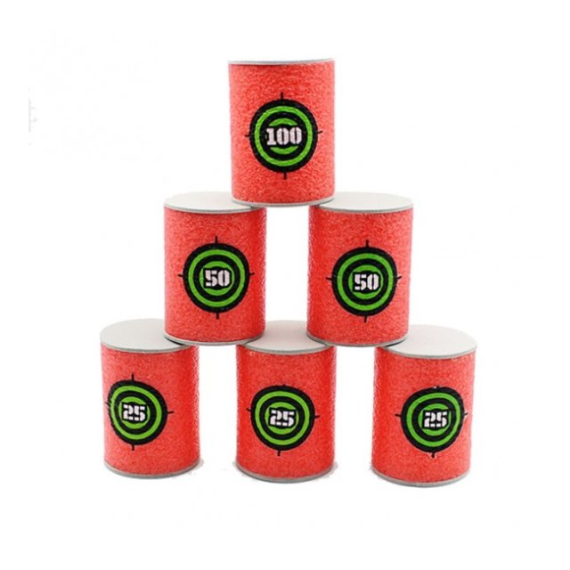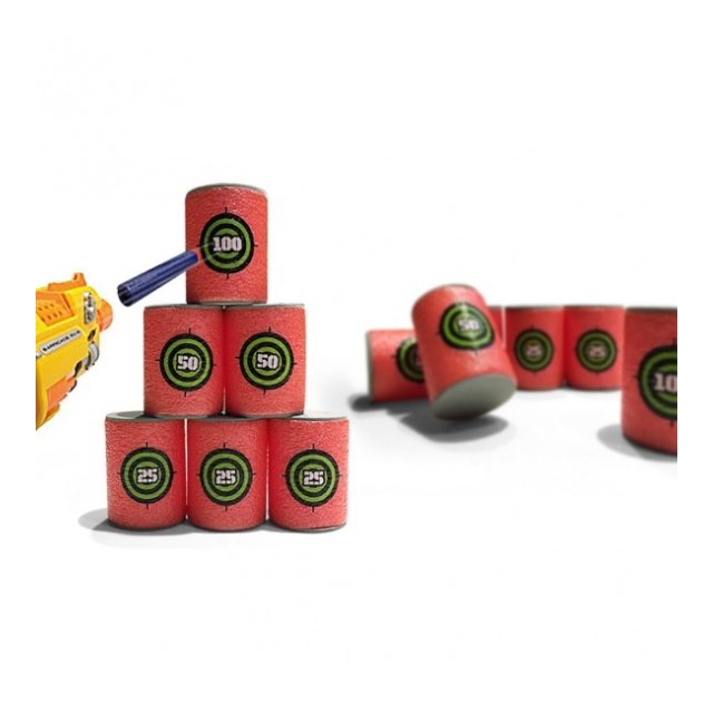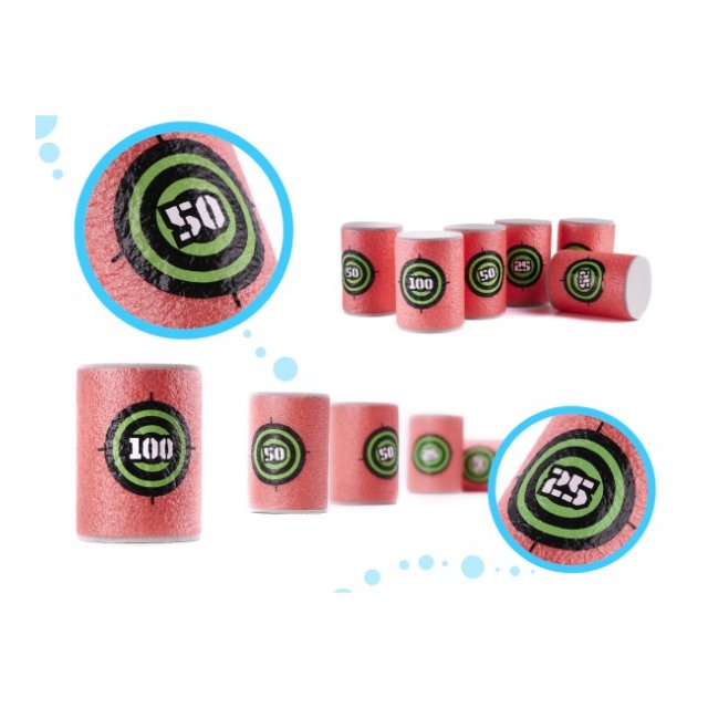 Komplekts no 6 mīkstajiem šautriņu mērķiem-mucām. Viņi dažādos spēli un palīdzēs praktizēt precizitāti. Izgatavoti no vieglām mīkstām putām. Izmēri: augstums: 6 cm, diametrs: 4 cm