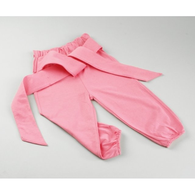 Meiteņu bikses modernā piegriezumā ar jostu priekšpusē un elastīgām lentēm kāju apakšdaļā. Izgatavotas no mīksta trikotāžas auduma. 100% kokvilna Ražots Polijā.