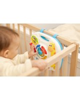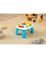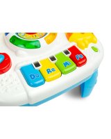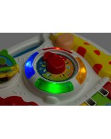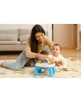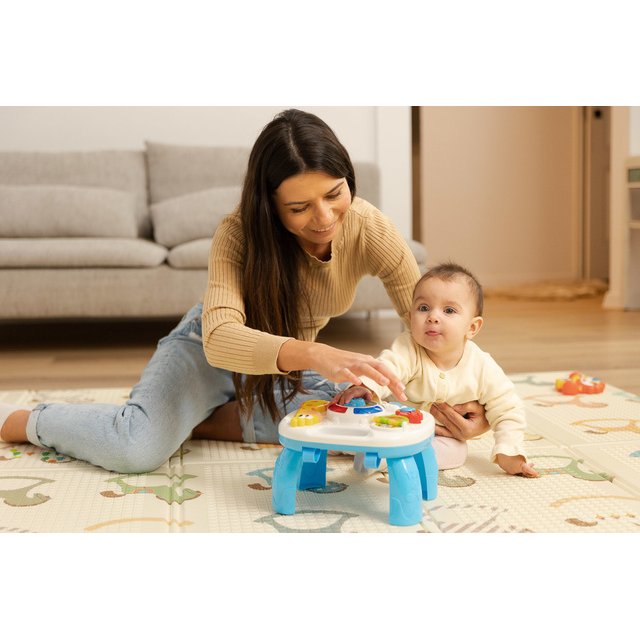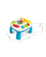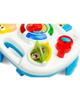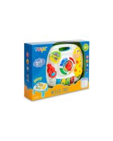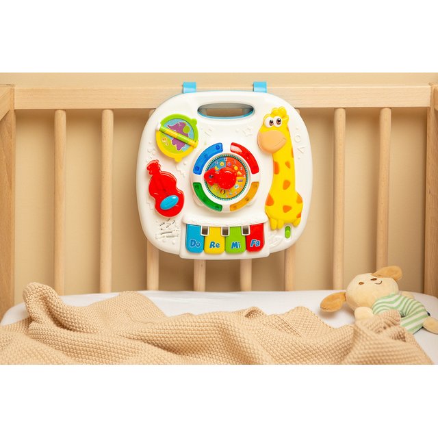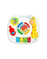Interaktīvais muzikālais galdiņš GIRAFFE TOYZ sagādās daudz prieka ikvienam bērnam. Rotaļlieta ir aprīkota ar dažādām melodijām,kuras var dzirdēt,kad bērns pieskarās galdiņa elementiem. Muzikālajā galdiņā ir: * mūzikas taustiņi do,re,mi, fa – atskaņo pazīstamu melodiju; * grāmata ar dzīvnieku bildēm - atskaņo dzīvnieku skaņas; * vijole – atskaņo divas patīkamas melodijas; * pulkstenis ar bultiņu un krāsainām diodēm - atskaņo dažādas melodijas atkarībā no ciparnīcas iestatītā diennakts laika. Rotaļlietu var izmantot 3 veidos: kā galdu, ar pieliekamajām kājām, kā spēļu planšeti, ko tur bērns rokās, kā spēļu paneli, kas piekārts pie bērnu gultiņas– pateicoties rotaļlietas apakšā izvietotajām siksnām. Tehniskie dati: Bērna vecums: 18+ mēneši Izmēri: 25 x 22,5 x 18 cm. Iepakojuma izmēri: 33,5 x 26 x 8 cm. Rotaļlietas svars: 0,400 kg, kopējais svars: 0,625 kg Baterijas: 3 x AA (nav iekļautas).