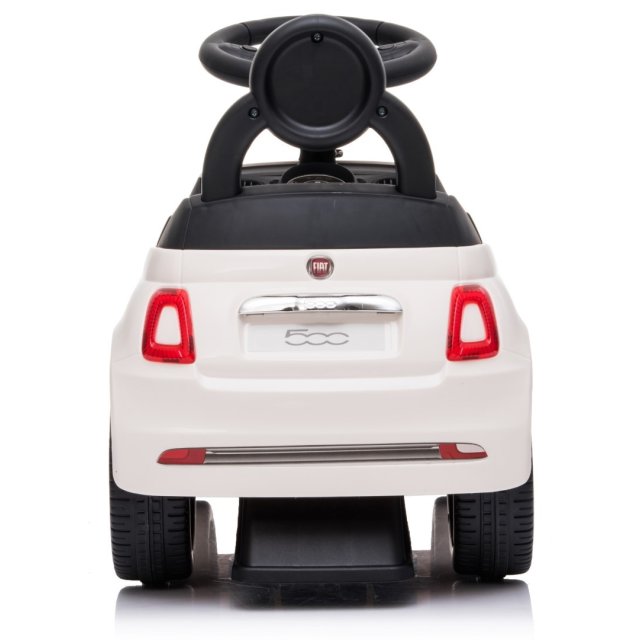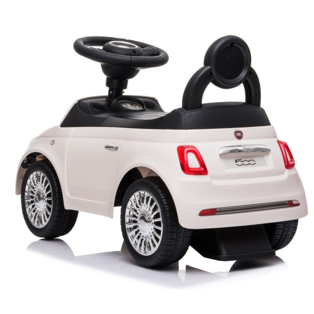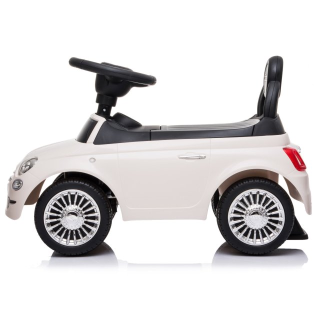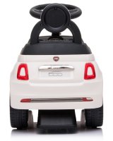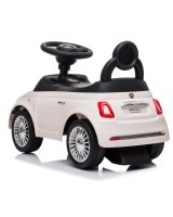 Oriģinālajai Fiat 500 rotaļu automašīnas izpildījumā. Mašīnai baltā krāsā ir visas šīs slavenās markas transportlīdzekļu īpašības.
