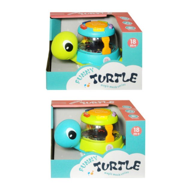 Bruņurupucis izdod bungu skaņas vai spēlē melodijas. Tas arī spīd ar dažādu krāsu gaismiņām. Iekšā atrodas mazie bruņurupuči, kas izdod grabulīša skaņas. Rotaļlieta darbojas ar AAA tipa baterijām. Baterijas nav iekļautas komplektā. Rotaļlieta ir pieejama vairākās krāsu variācijās, kas tiek izvēlētas nejauši. Cena norādīta par vienu vienību. Produkts ir iepakots kartona kastē ar logu. Rotaļlieta bērniem no 18 mēnešiem. Iepakojuma izmērs: 16x10x14 cm.