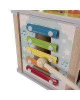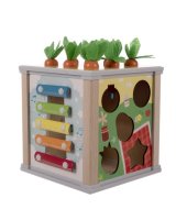 Katrā pusā ir sava radošā rotaļlieta, kas ietekmē bērna attīstību: ksilofons, formu šķirotājs, zobrati, pulkstenis un izņemami tārpi ar magnētu un burkāni.