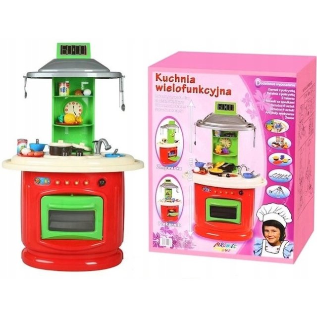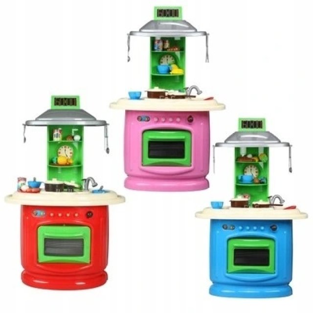 Rotaļlietai nav nepieciešamas baterijas.Virtuve ir pieejama dažādās krāsās, piemēram, sarkanā, zilā un rozā. Ideāla ideja lieliskai dāvanai. Iepakojuma izmērs: 63 x 49 x 34 cm. Ražots Polijā.