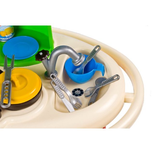 Šis ir ideāls rotaļu komplekts topošajam šefpavāram vai pavāram. Virtuvē ir daudz elementu, ar kuriem bērns ikdienā sastopas mammas virtuvē. Protams, neiztikt bez pamata virtuves piederumiem un pannām, kā arī pārtikas precēm. Virtuves augstums ir 100 cm.