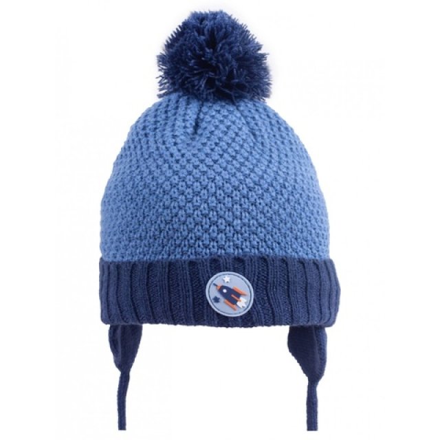 Zēna ziemas cepure zilā un tumši zilā krāsā ar jautru pomponu un atloku ar kosmosa raķetes aplikāciju.Trīsslāņu - ar siltinājumu un kokvilnas oderi iekšpusē. Cepure ir pielāgota tā, lai vēl vairāk aizsargātu ausis no aukstuma. Saites zem zoda.
