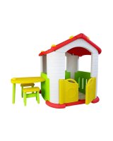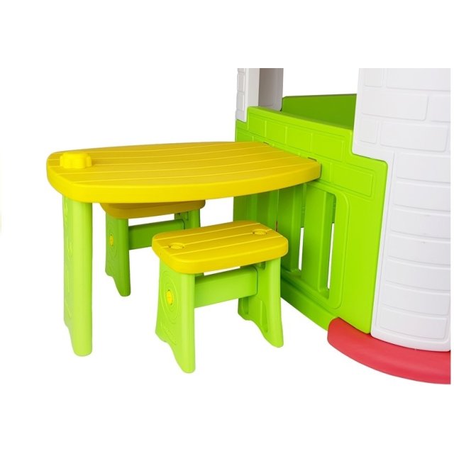 Komplektā ietilpst dārza mājiņa ar plaši atveramām durvīm. Ārpus mājas ir galds ar diviem krēsliem.