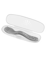 Profilētu galda piederumu komplekts: dakša un karote. Aprīkoti ar praktisku futrāli, tie ir ideāli piemēroti lietošanai ārpus mājas – pastaigās un ceļojumos. Products izgatavots no drošiem, augstas kvalitātes materiāliem, kas paredzēti saskarei ar pārtikas produktiem. Galda piederumu noapaļotās formas ir ideāli piemērotas maza bērna smalkajām smaganām. Produkts pilnībā nesatur bisfenolu A (0% BPA).