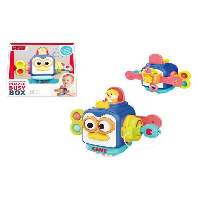 Interaktīvais izglītojošais kubs Puzzle Busy Box ar dažādiem elementiem, kurus var nospiest, pagriezt un pielāgot. Tam ir krāsainas pogas un kustīgas daļas, kas stimulē bērna maņas un attīsta kognitīvās spējas. Produkts ir iepakots kartona kastē. Norādītie izmēri ir iepakojuma izmēri: 18x17x11 cm. Rotaļlieta ir paredzēta bērniem no viena gada vecuma.