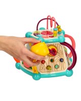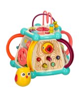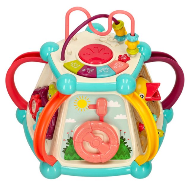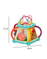 Interaktīvs izglītojošs kubs - rotaļlieta, kas paredzēta izklaidei un mācībām! Rotaļlietā ietilpst: - krāsaini zobrati, - formu šķirotājs, - spēle "Pabaro putnu", - automašīnas stūre, - labirints - un daudzi kustīgi elementi.   Rotaļlieta palīdz attīstīt roku-acu koordināciju, kognitīvās un motoriskās prasmes. Klavieres tiek darbinātas ar trim AA baterijām (nav iekļautas komplektā). Komplektā ir seši šķirošanas bloki, pieci tārpi un pūce. Tehniskie parametri: Materiāls: ABS, PP Vecums: 18 m+ Barošanas avots: 3 AA baterijas (nav iekļautas) Rotaļlietas izmēri: 26 cm x 26 cm x 21 cm Tārpa garums: 6 cm Pūces izmēri: 6 cm x 5 cm Bloka izmēri: 3,5 cm x 2,5 cm Iepakojuma izmēri: 30 cm x 24,5 cm x 25,5 cm.