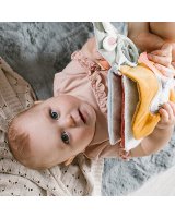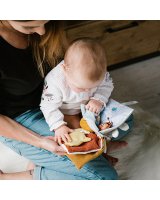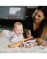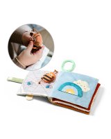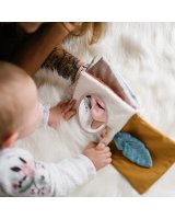 Čaukstošās lapas un elementi rada interesantus skaņas efektus, kas stimulē dzirdi. Šajā grāmatā ir arī pīkstuli, kuru skaņas ieinteresēs mazuli. Krāsainās aukliņas un lentes mudina tās satvert. Velcro elementus var piestiprināt un atsprādzēt, tādējādi attīstot taustes un koordinācijas sajūtu. Spogulis parādīs jūsu bērnam pasauli no otras puses. Tas padara spēli vēl interesantāku un aizraujošāku.