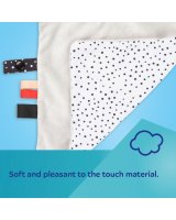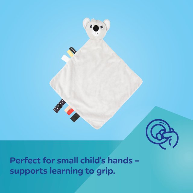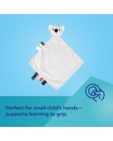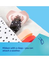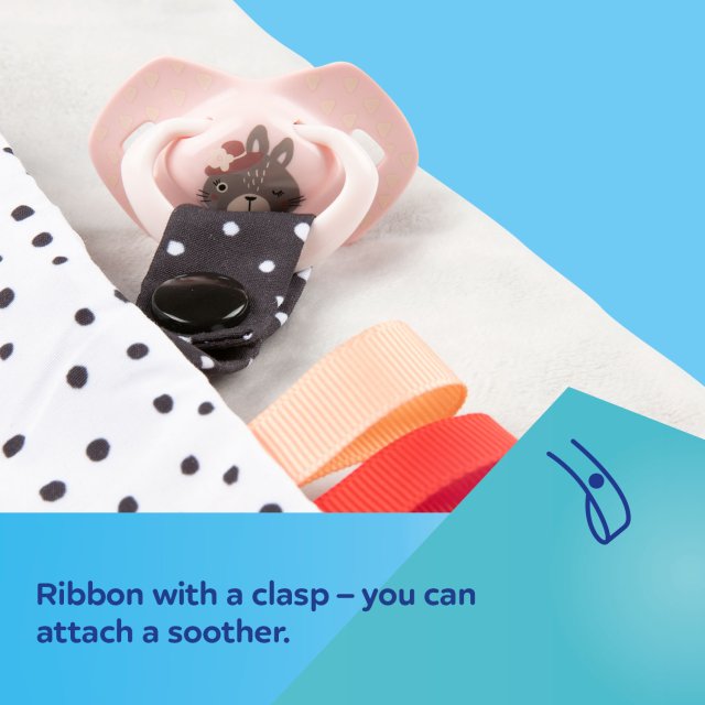 Bērnu auduma rotaļlieta ir aprīkota ar siksniņu ar aizdari, pie kuras var piestiprināt mānekli. Rotaļlieta lieliski iederas maza bērna rokās, atbalstot bērna satvērienu un maņu attīstību.