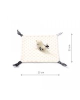 Melnbaltās lentes un mezgli,kas ir pievienoti pie rotaļlietas palīdzēs bērnam vingrināties. Spīdīgs zelta deguntiņš piesaista uzmanību. Aste ir dekorēta ar rakstainām izvirzītām detaļām, kas palīdz attīstīt veiklību. Miega lupatiņa ir ideālā izmērā, kas iederēsies mazuļa mazajās rociņās. Tas padara to par ideālu pavadoni jūsu mazajam.