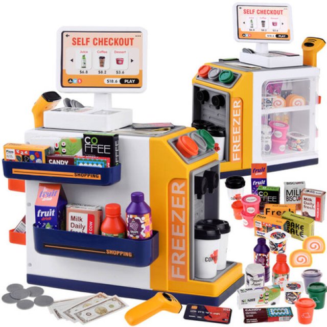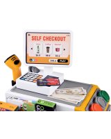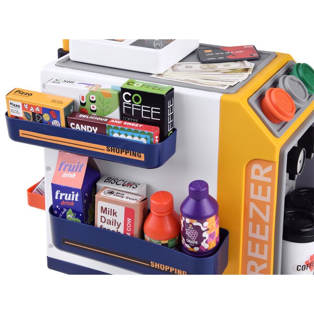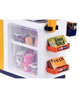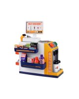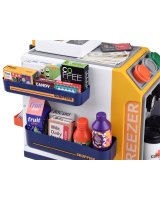 Pašapkalpošanās pārtikas veikals ar kafijas automātu un dzērienu ledusskapi. Ātrā servisa punkts ir piedāvājums visiem jaunajiem uzņēmējiem, kuri seko jaunākajām tendencēm pakalpojumu nozarē. Veikalā ir kafijas automāts, ledusskapis dzērieniem, desertiem un kase ar lasītāju. Lieliska ideja pārdevēja spēlei, dzērienu un uzkodu apkalpošanas vietai! Komplektā ietilpst 46 elementi: -atsevišķs veikals ar kafijas automātu un slēdzamu ledusskapi - skaņas kases aparāts ar karšu lasītāju - skeneris ar skaņu un gaismu - divas kafijas tase - divas mazas espresso tasītes - kārba augļu sulas - pudele vīnogu sulas - pudele apelsīnu sulas - 2 x jogurts - 2 x saldējums - kartona kastes ar: vīnogu sulu, piena cepumiem, pienu, suši, konditorejas izstrādājumiem, kafiju, svaigu apelsīnu sulu, konfektes, picu (imitācija) - monētas un banknotes - kredītkarte. Barošanas avots: kases aparāts 2 x 1,5V AA; skeneris 2 x 1,5 V AAA (baterijas nav iekļautas). Izmēri: - veikals 38 x 25 x 21 cm - kases aparāts 15 x 11 x 16 cm - skeneris 10 x 5,5 x 2 cm. - iepakojums 41 x 25,5 x 12 cm, svars 1,15 kg. Viss komplekts ir no izturīgas plastmasas, pievilcīgās krāsās, tam ir plaukti, aizverams ledusskapis dzērieniem, viss, kas nepieciešamas šādā ātrās apkalpošanas punktā.Bērniem patīk spēlēt pārdevējus un pircējus, un šāda rotaļlieta vienmēr iemācīs kaut ko jaunu. Veikals ir ļoti estētiski un efektīvi iekārtots un katram bērnam sniegs daudz pozitīvu emociju. Komplekts iepakots krāsainā kartona iepakojumā.   EAN 5905258524559