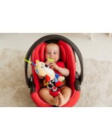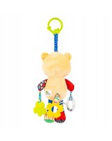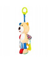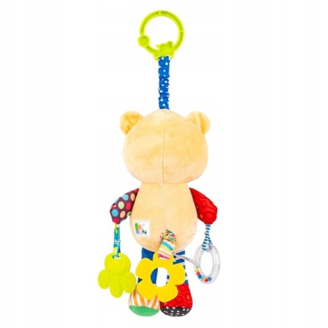 Krāsainais lācis dažādos veidos izklaidēs jūsu mazuli. Rotaļlietai ir grabulītis un divi mīksti zobgraužņi, kas atvieglo zobu šķilšanās sāpes mazuļu smaganās. Viens no graužamajiem - zieds - ir piestiprināts lācīša astes vietā un atskaņo melodiju. Vienkārši pavelciet to, un lācēns atskaņos mīļu šūpuļdziesmu. Virs lācīša galvas ir auduma harmonika, un, rotaļlietu nedaudz pavelkot, tā atvelkas. Lācis ir izgatavots no dažādu krāsu, rakstu un faktūru materiāliem, tāpēc tas stimulē mazuļa maņas, attīstot viņa izziņas spējas. Izstrādājums ir piemērots bērniem no dzimšanas.