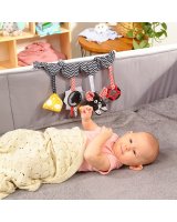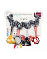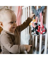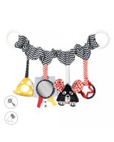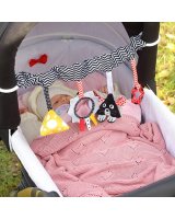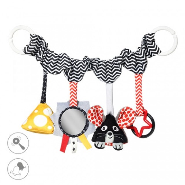 Interesanti elementi rosina zinātkāri un piesaista bērna uzmanību ar kontrastējošiem rakstiem un krāsām. Jūsu mazajam būs jautri izzināt pasauli, vienlaikus attīstot redzes un dzirdes koordināciju.Pateicoties universālajam turētājam, rotaļlietu var pakarināt uz ratiem, automašīnas sēdekļa vai gultas. Maiga grabuļa skaņa piesaista mazuļa uzmanību un nomierina. Peles ausīs paslēptie čaukstošie elementi ieinteresēs Jūsu bērnu un piesaistīs viņa uzmanību. Spogulis ļaus bērnam ieraudzīt savu atspulgu. Spoguli ieskauj krāsainas lentītes, pievēršot tam īpašu uzmanību. Bērns tās var viegli satvert un izpētīt materiāla faktūru. Elementu daudzveidība ļauj radoši spēlēties.