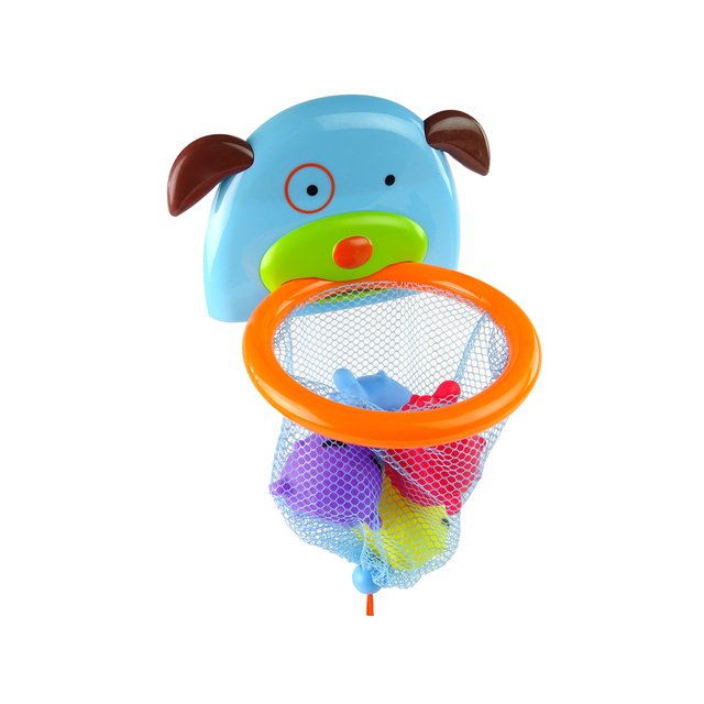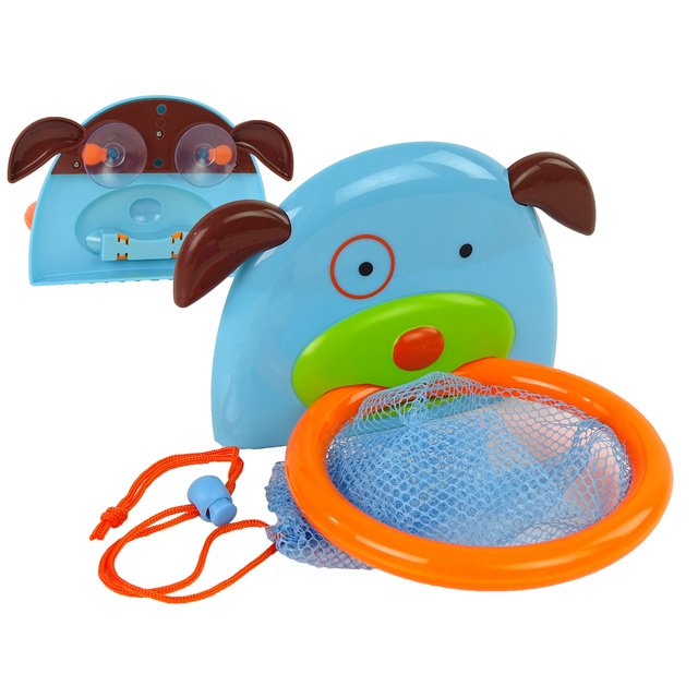 Vai jūsu mazulim nepatīk peldēšanās? Padarīsim šo procesu jautrāk! Mini basketbols ar draudzīgu suņa tēlu palīdzēs jūsu mazajam vannošanās laiku saistīt ar kaut ko patīkamu un padarīs to jautru. Metot gumijas bumbas-zivtiņas, viņš var attīstīt roku-acu koordināciju, koncentrēšanos un roku prasmes. Tīklam ir rāvējslēdzējs, tāpēc grozu var izmantot arī kā rotaļlietu turētāju vannas istabā. Rotaļlietu ātra žāvēšana novērsīs pelējuma veidošanos. Abi komplektācijā iekļautie piesūcekņi lieliski pielīp gludām virsmām, tāpēc tos var piestiprināt pie flīzēm vai stikla. Četrām zivīm ir mazi caurumi, kas ļauj iekļūt ūdenī, un, nospiežot rotaļlietu, ūdens izšļakstās smieklīgā veidā, kas noteikti liks jūsu bērnam smieties.