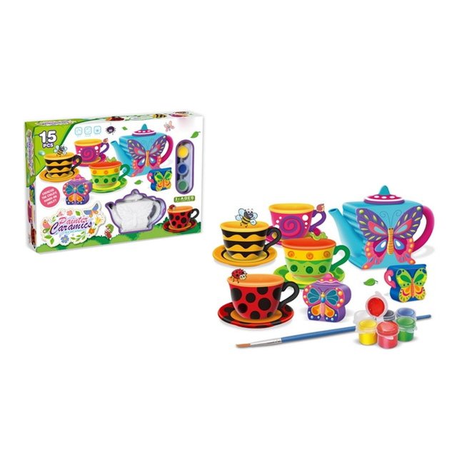 Radošs porcelāna trauku komplekts bērniem. Tagad bērni varēs izveidot komplektu jebkurās krāsās, kas viņiem patīk. Komplektā ietilpst: tējkanna, cukurnīca, piena kanniņa, 4 tases un 4 šķīvji, kā arī otas un 6 krāsu krāsas. Komplektā ir 15 elementi. Rotaļlieta bērniem no 3 gadu vecuma. Produkts ir iepakots kartona kastē. Norādītie izmēri ir iepakojuma izmēri: 30x20x6 cm.