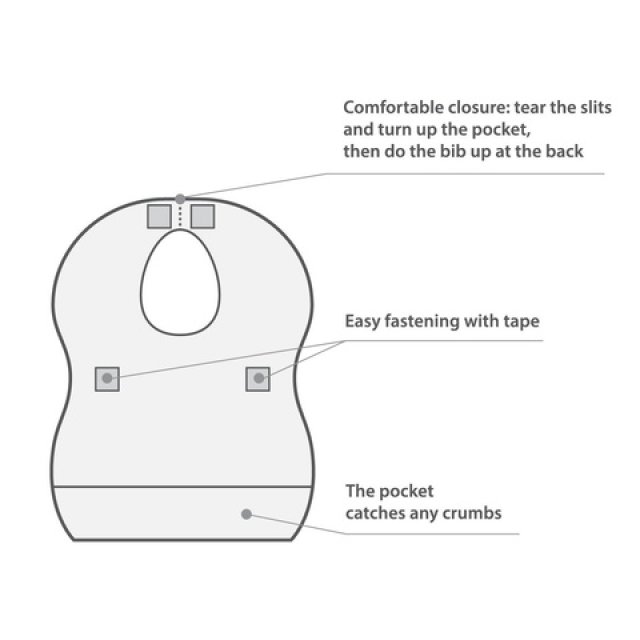 Vienkārša uzstādīšana. Noplēsiet perforāciju, pagrieziet kabatu uz āru, aizveriet to aizmugurē, un jūsu mazulis būs pasargāts no netīrumiem un gatavs ēst.