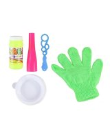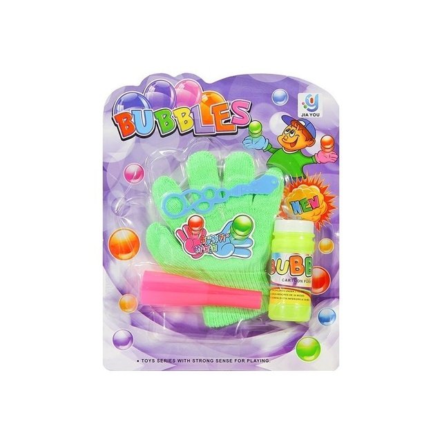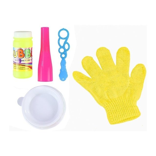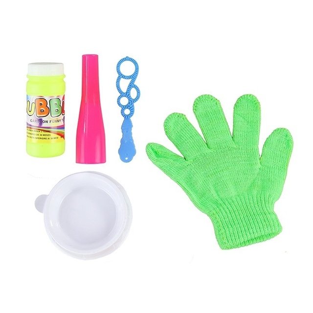 Komplektā ietilpst: - šķidruma trauks - caurulīte - pūtējs - burbuļu šķidrums - viens cimds: universāls izmērs.