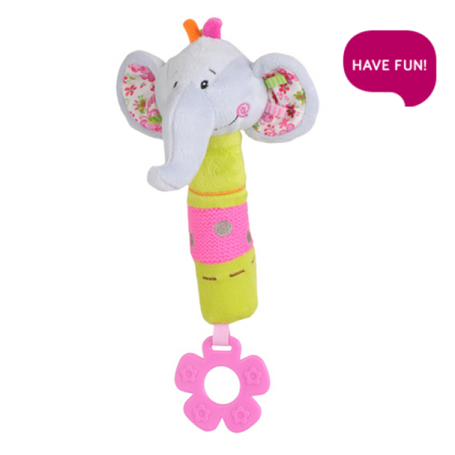Dzīvespriecīgs zilonītis ar lielu stumbru un taustei patīkamām ausīm tikai gaida, lai to paņem kopā rotaļāties. - pateicoties savai formai, tas palīdz iemācīties pārvietot priekšmetus no rokas uz roku, - priecē acis ar jautrām, pavasarīgām krāsām, - viegli satvert pat ar mazajām, nepieredzējušām rokām, - dažādi materiāli un faktūras, kā arī čaukstošais vēderiņš veicina bērna attīstību - lentes, ausis, stumbrs un zobgrauznis mudina apgūt formas un krāsas - pat neliels spiediens uz rotaļlietu rada maigu pīkstošu skaņu, kas stimulē bērna sajūtas un māca cēloņu un seku sakarības. Iepakojuma izmēri 8x24x7 cm