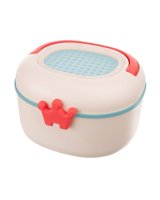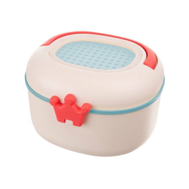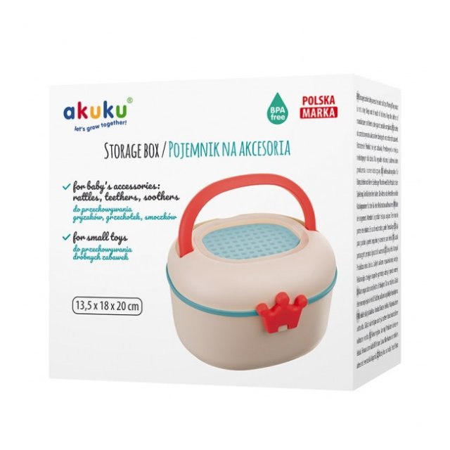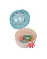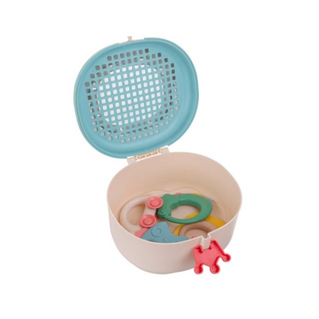 Dekoratīvā kastīte ir ideāli piemērota grabulīšu, zobgraužņu un sīko piederumu uzglabāšanai. Īpašs, praktisks kroņa formas aiztaisamais garantē ciešu aizdari. Produktam ir rokturis ērtai pārnēsāšanai un praktiska aizdare ar speciālu vāka atvēršanas sistēmu. Iekšā ir sietiņš, kas, no vienas puses, ļauj izžāvēt rotaļlietas pēc mazgāšanas, no otras puses, var darboties kā siets smilšu sijāšanai spēlējoties smilšu kastē. Kastītei augšpusē ir caurspīdīgs lodziņš satura pārbaudei.