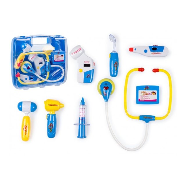 Māca pamata medicīnas iemaņām. Komplektā ietilpst: stetoskops ar skaņas efektiem, termometrs ar gaismas efektiem, tonometrs ar gaismas efektiem, ausu testeris ar gaismas efektiem, šļirce, āmurs, ārsta nozīmīte, rīkles pārbaude ar spoguli un gaismas efektiem. Specifikācijas: