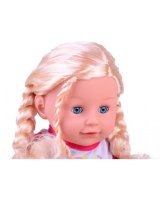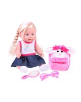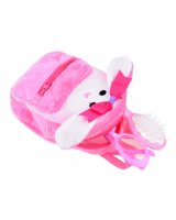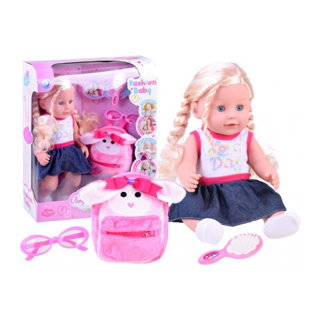 Komplektā ietilpst: - lelle ar gariem matiem - rozā brilles - plīša mugursoma ar truša ausīm.