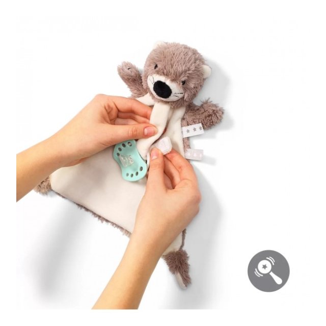 Mīksts talismans izgatavots no dažādiem materiāliem ar interesantu struktūru un aprīkots ar iekšēju grabulīti. Tas attīsta maza bērna kognitīvās spējas un dod arī drošības sajūtu. Lentes, kas piešūtas pie auduma, palīdzēs veiklības attīstībā, un mānekļa turētājs ar divpusēju Velcro, kas piestiprināts pie rotaļlietas, neļaus pazaudēt svarīgu piederumu.