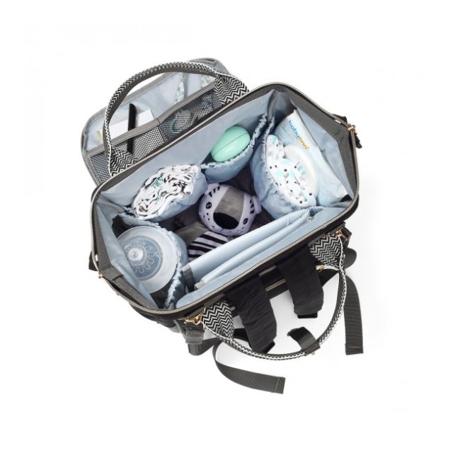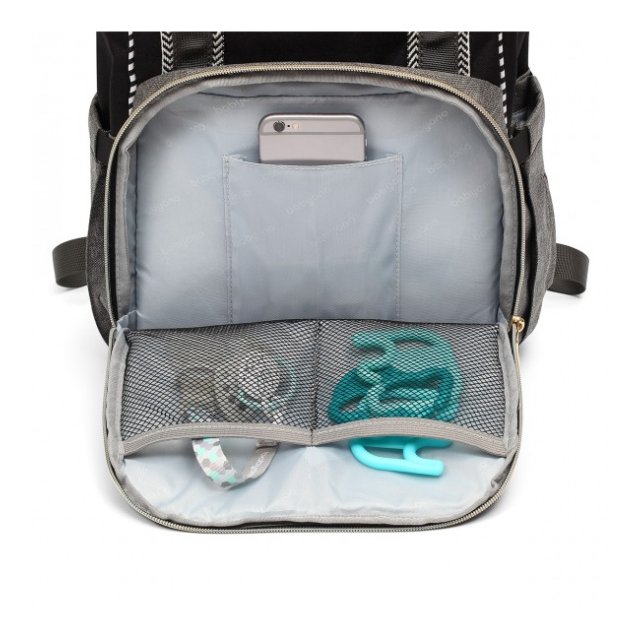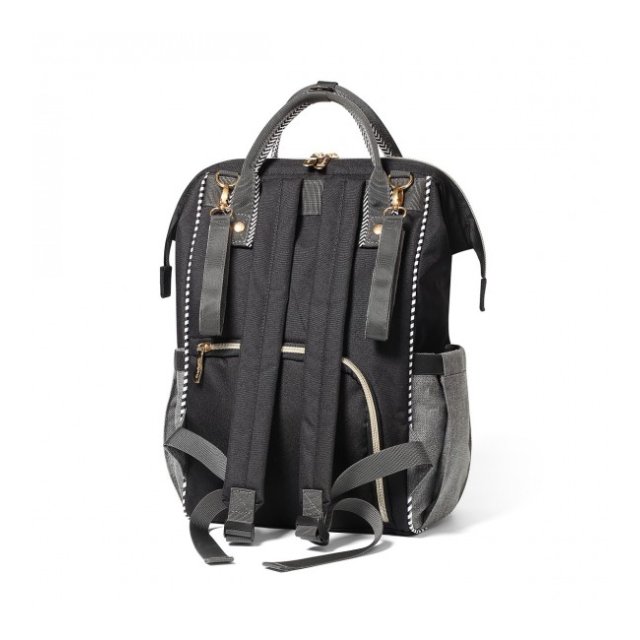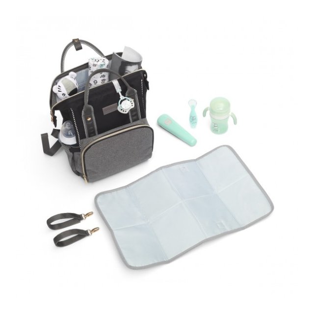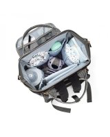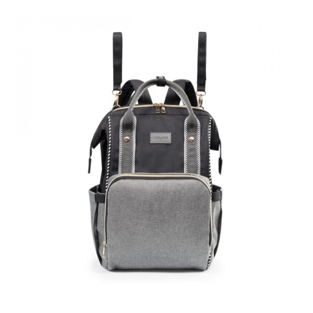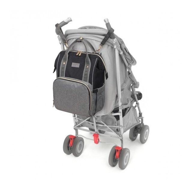 Daudzfunkcionālā mugursoma, kas paredzēta mūsdienu māmiņām, kuras vada aktīvu dzīvesveidu un novērtē produktu augsto kvalitāti. Mugursomas praktiskā forma ar 12 speciālām kabatām ļauj ērti novietot lietas iekšpusē un nēsāt to uz muguras vai piestiprināt pie ratiņiem. Turklāt, ērta pieeja kabatai un tās siltumizolācijas funkcija  ļauj uzturēt vēlamo ēdiena temperatūru. Ērta  piestiprināšana pie ratiņiem, kā arī  regulējamas plecu siksnas nodrošina lietošanas komfortu. Izturīgs ārējais materiāls un pastiprināti elementi garantē stabilitāti un padara mugursomu par pielāgotu dažādiem lietošanas apstākļiem. Ideāli piemērota gan ikdienas pastaigām, gan ceļojumiem Šāda mugursoma būs uzticams palīgs jebkuros apstākļos un atvieglos vecāku ikdienas dzīvi. Īpatnības:     * 12  kabatas, tai skaitā siltumizolēta kabata pudelēm, kabata mitriem priekšmetiem, kabata ātrai piekļuvei tālrunim vai citām drēbēm.     * Mīkstas un ērtas regulējamas plecu siksnas un īsie rokturi.     * Galvenais nodalījums ar diviem rāvējslēdzējiem.     * Noņemamās sānu siksnas atvieglo piestiprināšanu pie ratiem.     * Pastiprināta konstrukcija un augstas kvalitātes apdare.     * Viegli kopjama.     * Atslēgu lente.     * Paklājiņš pārtišanai.      Tehniskā specifikācija:         Materiāls: 100% poliesters         Izmēri: platums 30 cm x augstums 40 cm x dziļums 16 cm         Svars: 0,76 kg