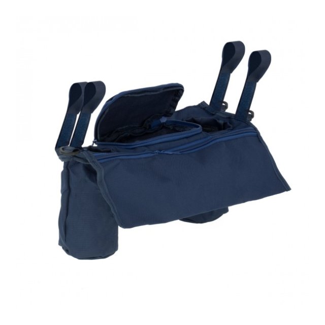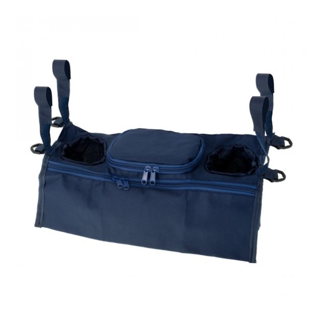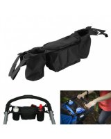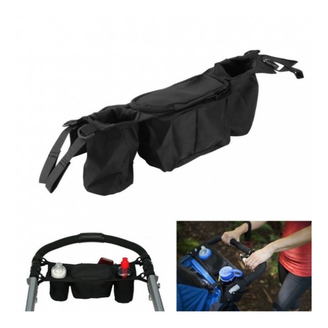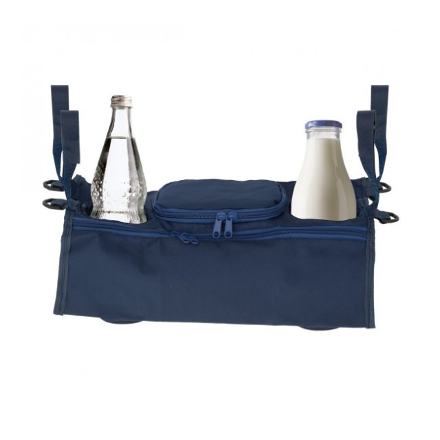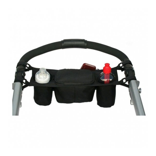 Praktisks organaizers ratiņiems. Tajā saies visas nepieciešamās lietas: autiņi, salvetes, rotaļlietas, piena vai dzēriena pudele un tālrunis. Organaizeram ir 4 kabatas: * 2 atvērtas pudelēm * gara kabata ar rāvējslēdzēju * mazāka kabata ar rāvējslēdzēju Lielisks aksesuārs, kas noteikti patiks ikvienai jaunai māmiņai. Viegli  stiprināms uz ratiņu roktura ar velcro siksnām. Izmēri: 36x12x13cm Nodalījums pudelēm apm. 7 cm diametrā Iepakojuma izmēri: 16x13x5 cm.