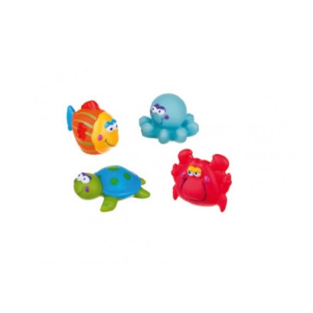 Komplekts sastāv no 4 dažādiem dzīvnieciņiem: - zivs, krokodils, krabis, astoņkājis. Katrai rotaļlietai ir caurums, caur kuru var izsmidzināt ūdeni. Tagad vanna būs lielisks piedzīvojums ar gumijas draugiem!