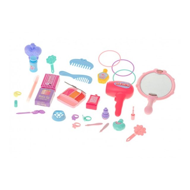 Komplektā ir: koferis, žāvētājs, spogulis, ķemme, apročes, gredzeni, rokassprādzes, uzlīmju komplekts, krāsainas pudelītes, kas imitē nagu laku un smaržas.