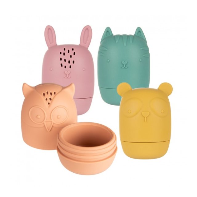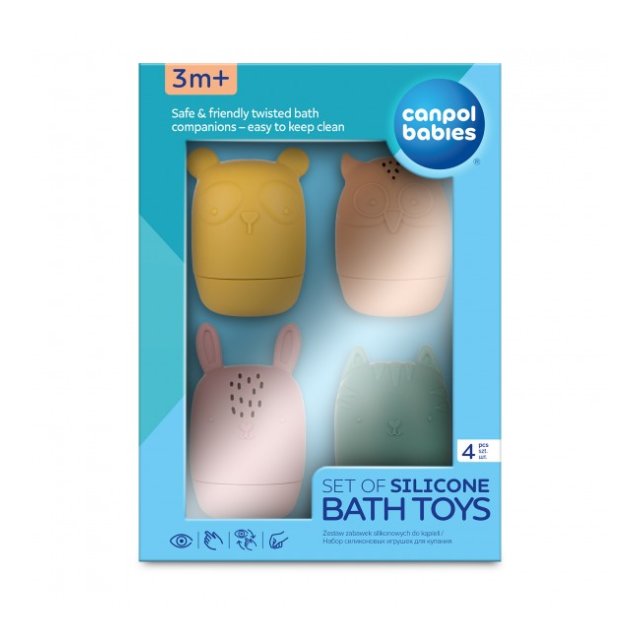 Komplekts no 4 jakām vannas rotaļlietām dažādās krāsās un faktūrās padarīs ikvienu vannu patīkamāku. Rotaļlietu atvērta konstrukcija ļauj tās rūpīgi mazgāt un izžāvēt iekšpusē, novēršot netīrumu un pelējuma uzkrāšanos. Tas ir ērts un ļoti higiēnisks risinājums, kas izstrādāts, domājot par bērnu veselību un drošību. Vannas rotaļlietu komplekts izraisa bērna interesi un māca radošu domāšanu, izmantojot dažādas spēļu iespējas. Rotaļlietas var atvērt, kā arī brīvi kombinēt augšējo un apakšējo daļu, lai tās attīsta bērna iztēli un radošumu. Piepildītas ar ūdeni, pēc nospiešanas tās izsmidzina ūdeni – tas trenē precizitāti un sagādā daudz prieka. Canpol 2-in-1 bērnu vannas rotaļlietas ir izgatavotas no mīksta silikona, kas nesatur BPA, un tās var izmantot kā mazuļa zobu graužamos. Canpol bērnu vannas rotaļlietas ir veidotas tā, lai tās atbilstu bērna rokai, tādējādi bērnam ir viegli satvert un droši rotaļāties, veicinot attīstību. Produkts bez BPA Ieteicamais vecums 3m+