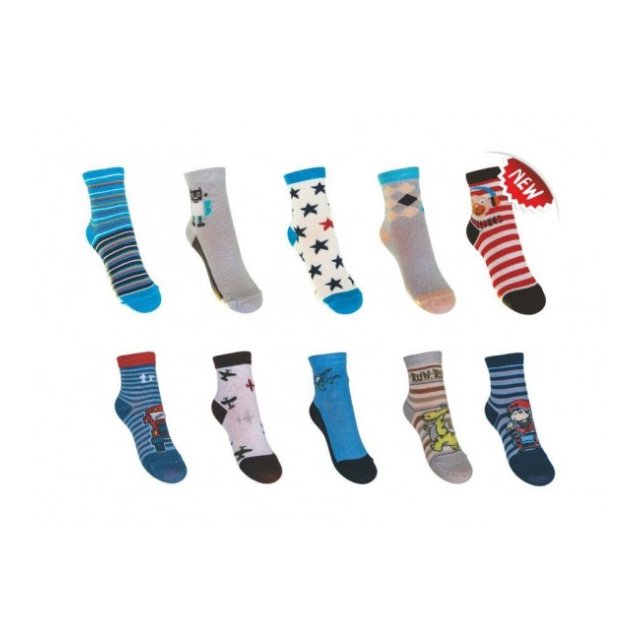 Bērnu zeķes ar puiciskiem zīmējumiem. Pateicoties elastīgajam materiālam, zeķes labi pieguļ pēdai. Sastāvs: 80% kokvilna, 15% poliamīds, 5% elastāns.