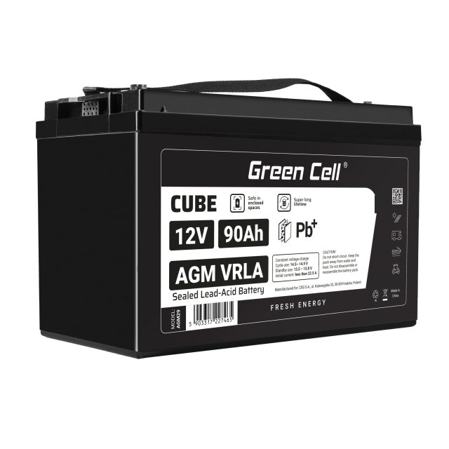 Description: Capacity: 90Ah;Voltage: 12V;Warranty: 24 months;Type: VRLA AGM;Colour: Black;Product code: AGM12V90AH;Manufacturer: Greencell;Size: 330x172x214mm;Weight: 24,6 kg;Terminal: Śruba M6;Vitality: ponad 5 lat;Max. discharge current: 3C;Stopień ochrony: IP54;Pojemność wg. temperatury: (40 °C - 102%) (25 °C - 100%) (0 °C - 85%) (-15 °C - 65%);Ładowanie buforowe: 13,5 – 13,8 V (-20 mV/C);Ładowanie cykliczne: 14,5 – 14,9 V (-30 mV/C);Rezystancja wewnętrzna: ≤8.5mΩ (przy temp. 25°C);Wysokość całkowita (z konektorami): 223 mm;Maksymalny prąd ładowania : 27 A;Zastosowanie : do łodzi i instalacji fotowoltaicznych;Zakres pojemności : powyżej 50Ah;Samorozładowanie: 2% w ciągu miesiąca (przy temp. 25°C)